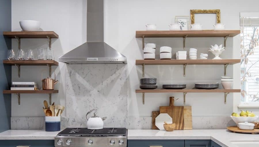 If you really want the open or minimalist look, but don’t have the time to keep things significantly scaled down and organized, consider the trending popularity of shelves in your new kitchen design.